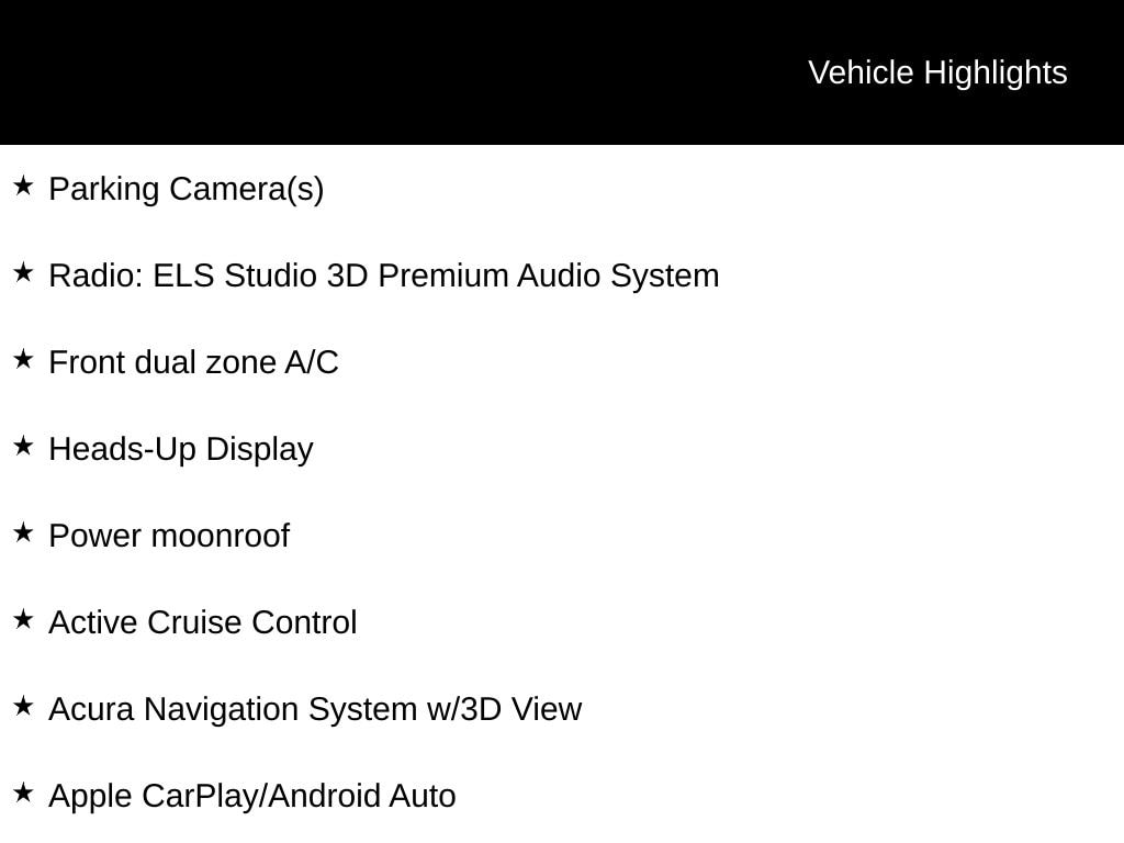 Parking Camera(s), Active Cruise Control, Acura Navigation System w/3D View, Apple CarPlay/Android Auto, Front dual zone A/C, Heads-Up Display, Power moonroof, Radio: ELS Studio 3D Premium Audio System.
