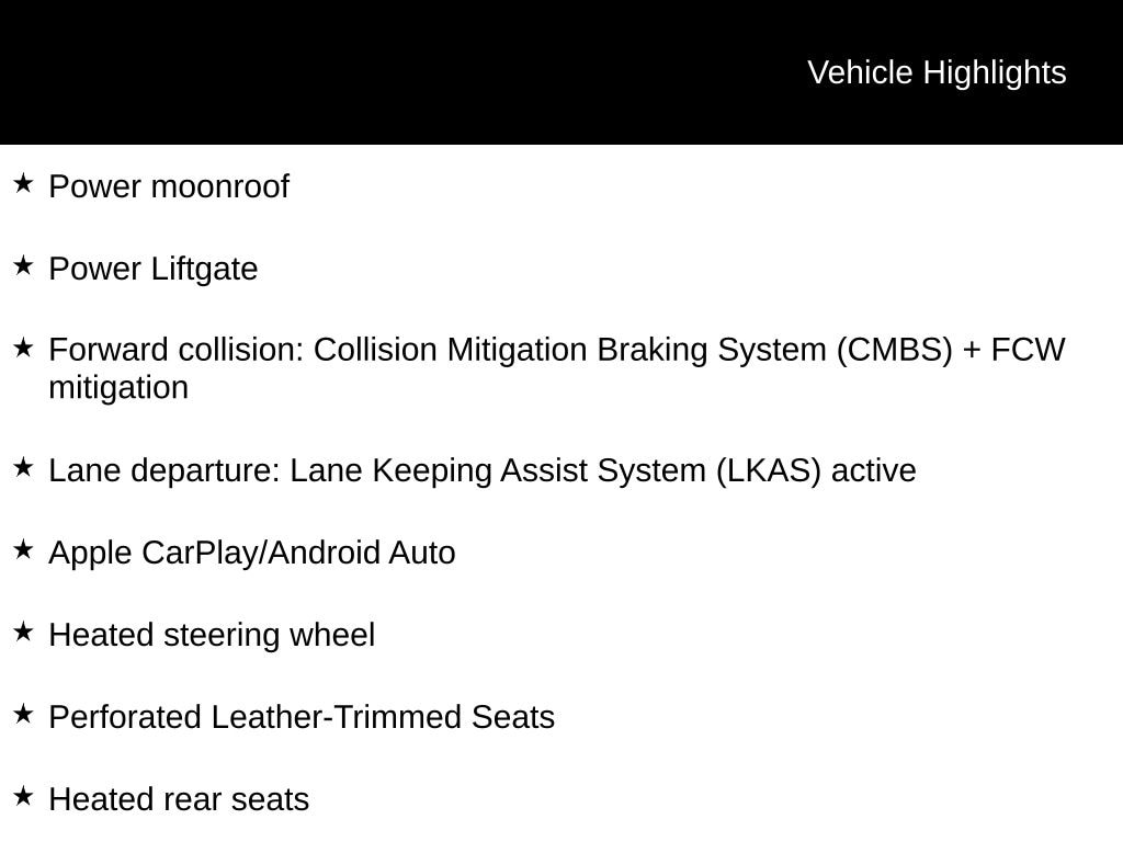 Apple CarPlay/Android Auto, Forward collision: Collision Mitigation Braking System (CMBS) + FCW mitigation, Heated rear seats, Heated steering wheel, Lane departure: Lane Keeping Assist System (LKAS) active, Perforated Leather-Trimmed Seats, Power Liftgate, Power moonroof, Power passenger seat.