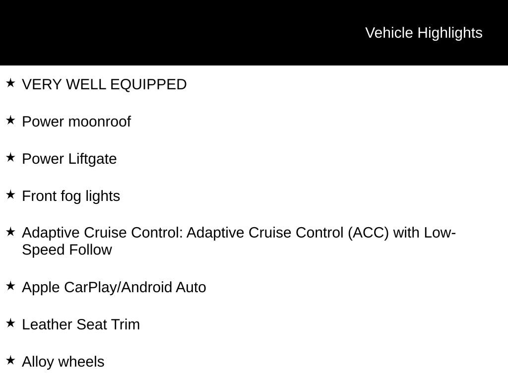 VERY WELL EQUIPPED, Adaptive Cruise Control: Adaptive Cruise Control (ACC) with Low-Speed Follow, Alloy wheels, Apple CarPlay/Android Auto, Front fog lights, Leather Seat Trim, Power Liftgate, Power moonroof.