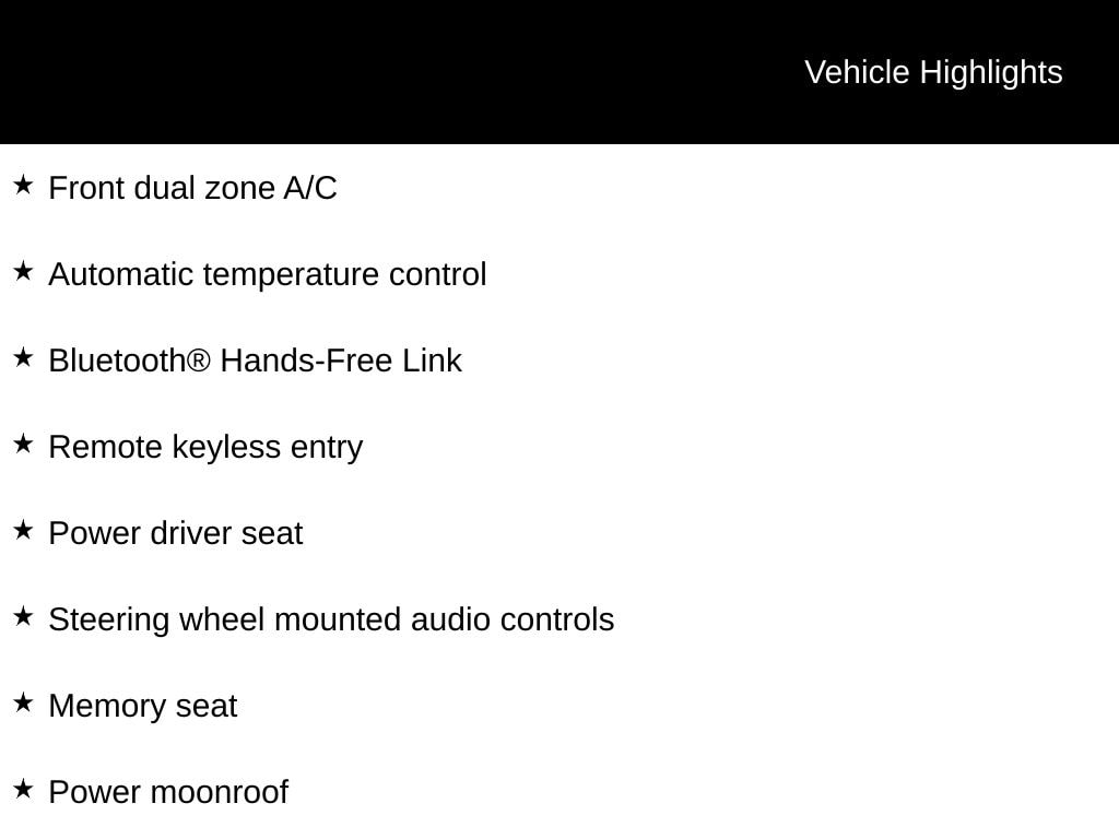 Active Cruise Control, Apple CarPlay/Android Auto, Automatic temperature control, Bluetooth® Hands-Free Link, Exterior Parking Camera Rear, Front dual zone A/C, Memory seat, Power driver seat, Power moonroof, Remote keyless entry, Steering wheel mounted audio controls.