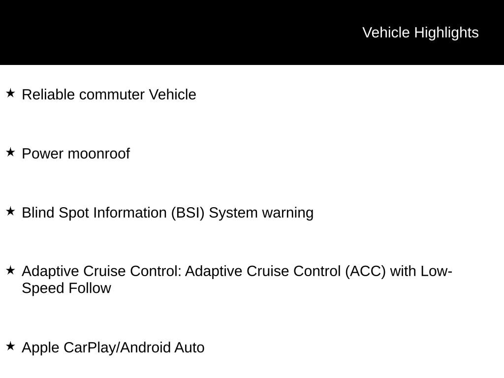 Reliable commuter Vehicle, Adaptive Cruise Control: Adaptive Cruise Control (ACC) with Low-Speed Follow, Apple CarPlay/Android Auto, Blind Spot Information (BSI) System warning, Power moonroof.