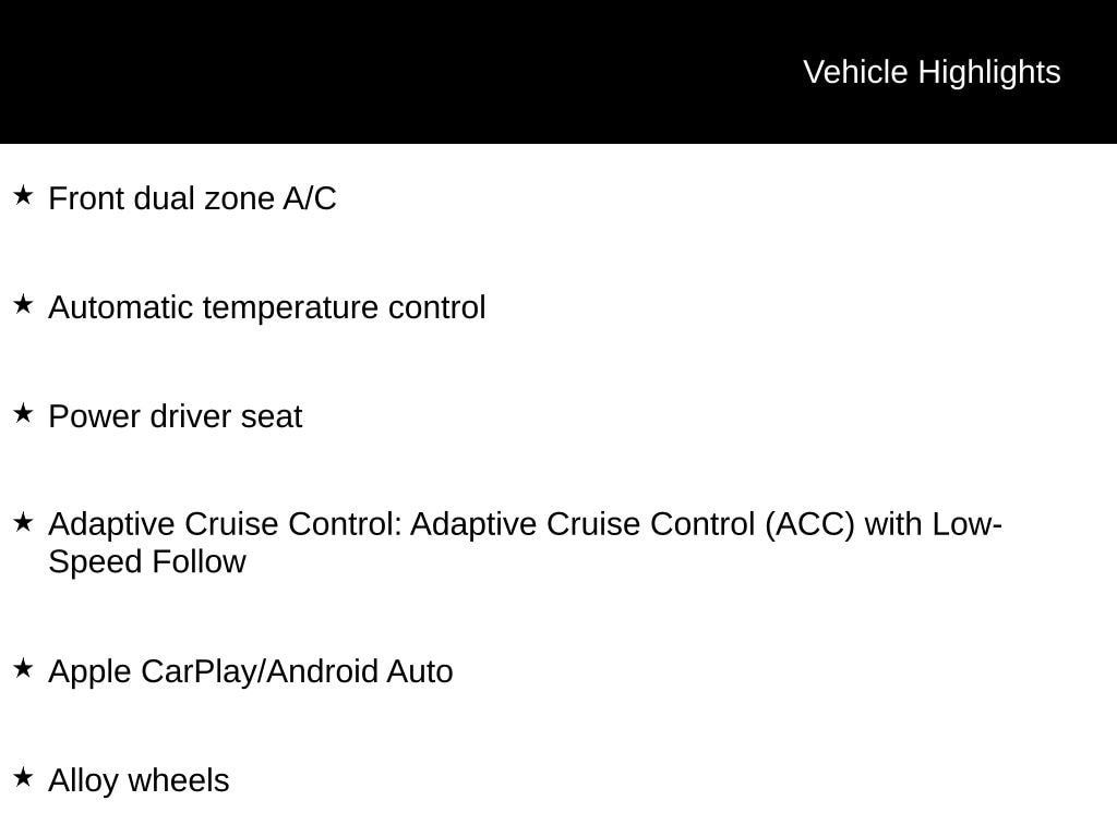 Adaptive Cruise Control: Adaptive Cruise Control (ACC) with Low-Speed Follow, Alloy wheels, Apple CarPlay/Android Auto, Automatic temperature control, Front dual zone A/C, Power driver seat.