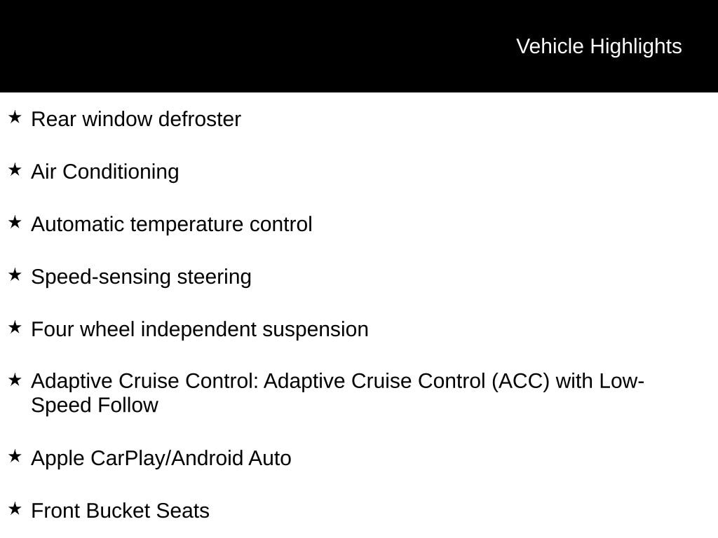 Adaptive Cruise Control: Adaptive Cruise Control (ACC) with Low-Speed Follow, Air Conditioning, Apple CarPlay/Android Auto, Automatic temperature control, Cloth Seating Surfaces, Four wheel independent suspension, Front Bucket Seats, Front Center Armrest, Rear window defroster, Speed-sensing steering.