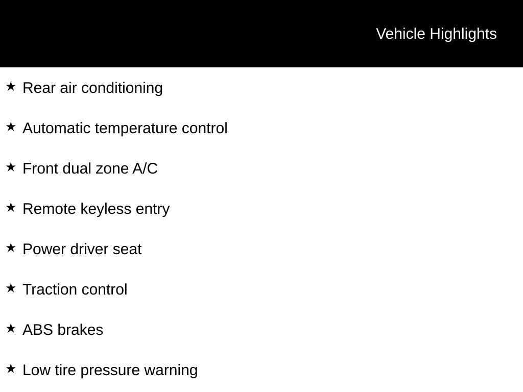 ABS brakes, Adaptive Cruise Control: Adaptive Cruise Control (ACC) with Low-Speed Follow, Alloy wheels, Apple CarPlay/Android Auto, Auto High-beam Headlights, Automatic temperature control, Delay-off headlights, Electronic Stability Control, Exterior Parking Camera Rear, Front dual zone A/C, Front fog lights, Fully automatic headlights, Heated door mirrors, Heated Front Bucket Seats, Heated front seats, Illuminated entry, Leather Seat Trim, Low tire pressure warning, Power driver seat, Power Liftgate, Rear air conditioning, Remote keyless entry, Traction control.