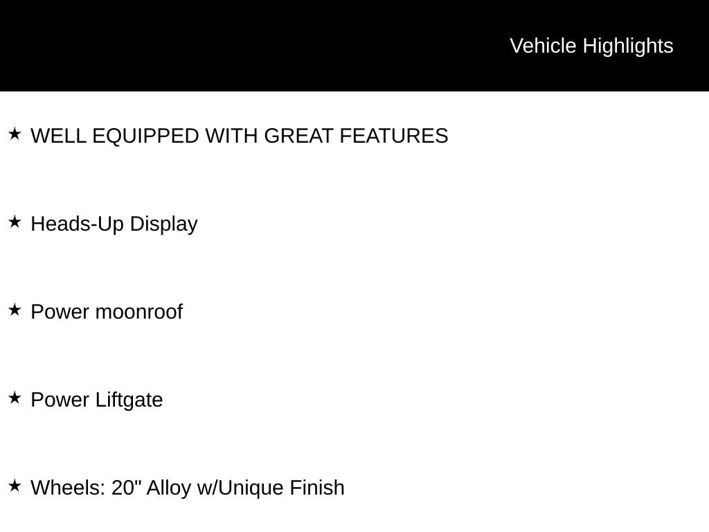 WELL EQUIPPED WITH GREAT FEATURES, Heads-Up Display, Power Liftgate, Power moonroof, Wheels: 20" Alloy w/Unique Finish.